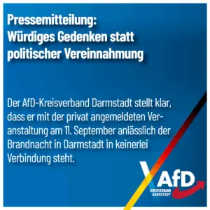 Würdiges Gedenken statt politischer Vereinnahmung Der AfD-Kreisverband Darmstadt stellt klar, dass er mit der privat angemeldeten Veranstaltung am 11. September anlässlich der Brandnacht in Darmstadt