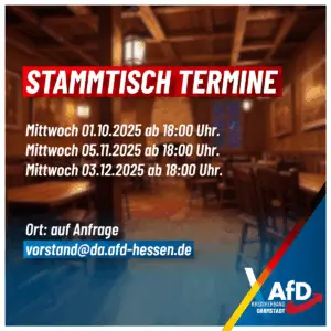 Liebe Freunde und Interessierte, leider müssen wir den Stammtisch am 29.04.2025 absagen. Wir werden euch zeitnah einen anderen Termin anbieten. Mit besten Grüßen,AfD Darmstadt