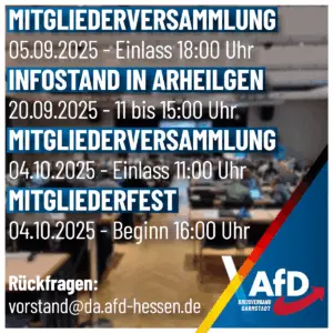 Liebe Freunde, wir laden euch herzlich ein, uns am 20. September 2025 von 11:00 bis 14:00 Uhr an unserem AfD-Infostand in Darmstadt-Arheilgen auf dem Löwenplatz