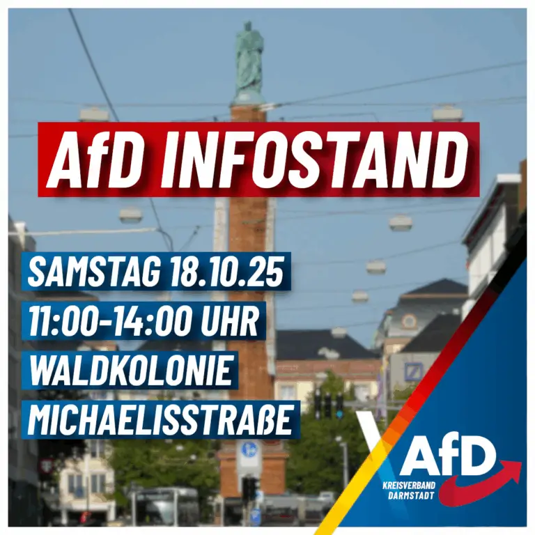 Liebe Freunde, wir laden euch herzlich ein, uns am 20. September 2025 von 11:00 bis 14:00 Uhr an unserem AfD-Infostand in Darmstadt-Arheilgen auf dem Löwenplatz zu besuchen! Kommt vorbei, lernt uns kennen und tauscht euch mit uns über die Zukunft unserer Stadt und unseres Landes aus. Wir stehen für eure