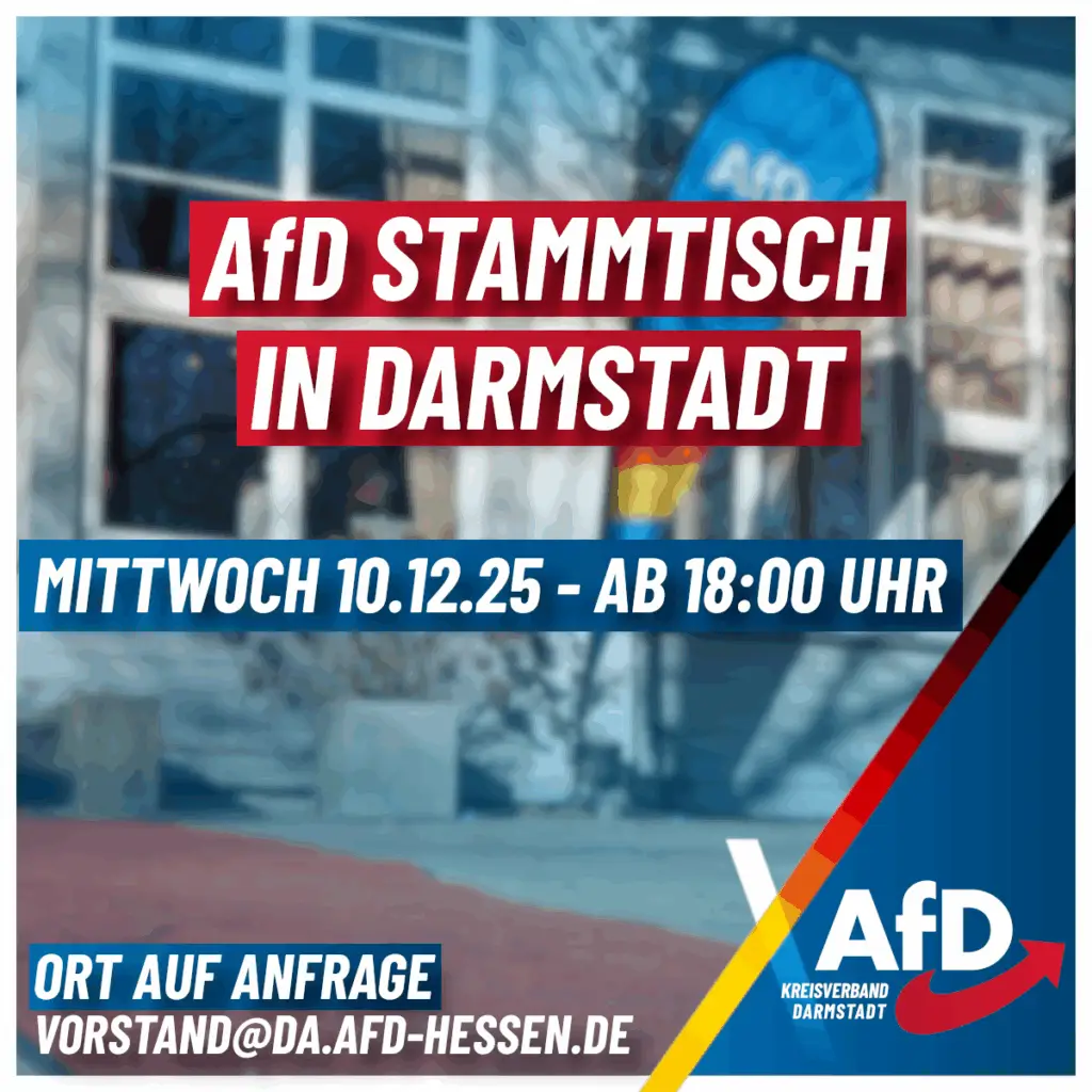 der letzte AfD-Stammtisch in diesem Jahr findet statt. Am Mittwoch, den 10. Dezember 2025, ab 18 Uhr treffen wir uns wie gewohnt in Darmstadt.