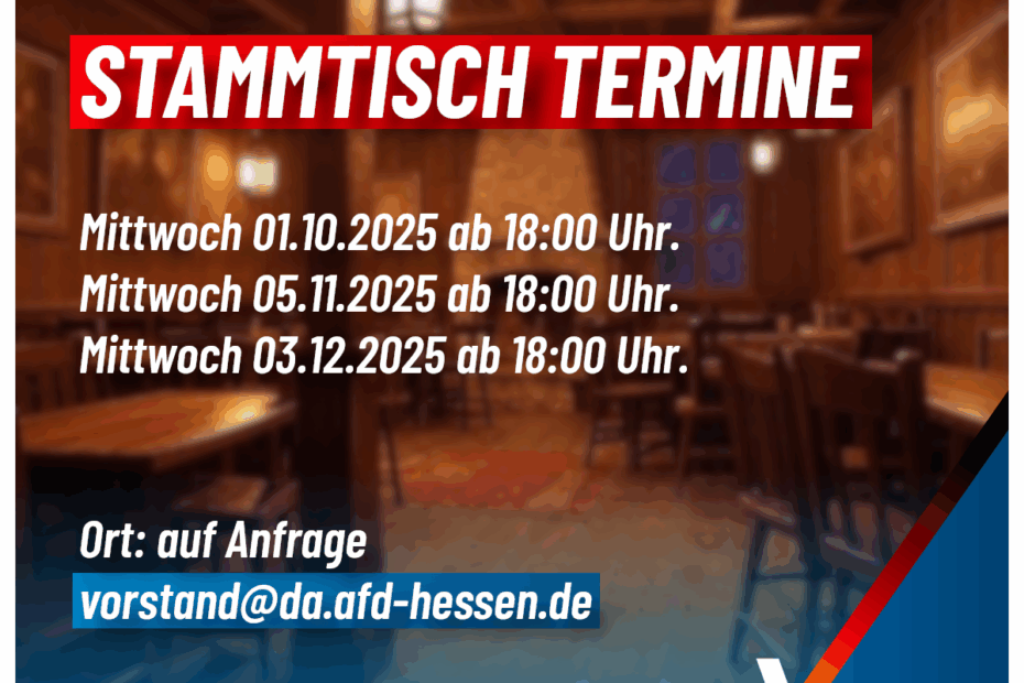Einladung zum Stammtisch des AfD-Kreisverbands Darmstadt Liebe Mitglieder, Förderer, Interessierte und Freunde der AfD,die Demokratie braucht starke Stimmen und wir sind diese Stimme! Im Kreisverband Darmstadt laden wir Sie herzlich zu unseren regelmäßigen Stammtischen ein.… AfD Stammtisch in Darmstadt