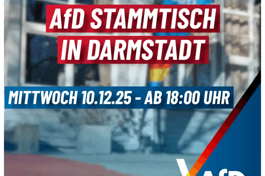 Letzter Stammtisch im Jahr 2025 Liebe Freunde und Unterstützer,der letzte AfD-Stammtisch in diesem Jahr findet statt. Am Mittwoch, den 10. Dezember 2025, ab 18 Uhr treffen wir uns wie gewohnt in Darmstadt. Der AfD-Kreisverband Darmstadt… Stammtisch am 10.12.25 ab 18:00 Uhr